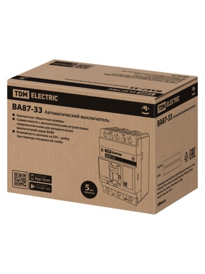 Назначение: Отключение тока при коротких замыканиях, перегрузке. Проведение тока в нормальном режиме. Оперативное включение и выключение электрических цепей. Применение: Электроподстанции. Жилое и гражданское строительство. Промышленные объекты. Преимущества: Совместимость с дополнительными устройствами, предназначенными для автоматических выключателей серии ВА88 Высокое качество Низкая цена Компактные габаритные размеры Конструкция: Возможность монтажа на DIN – рейку при помощи специальной скобы RCS1 (ВА87-33) Позволяет самостоятельно устанавливать дополнительные аксессуары. При необходимости допускается установка автоматических выключателей под углом до 30% в любую сторону без изменений номинальных характеристик. Позволяет использовать дополнительные устройства (АК, ДК, АК+ДК, РН, РМ, ¶ЭП-32/33, ЭП-35/37), предназначенные для авт. выключателей ВА88 Материалы: Напайки на силовых контактах (подвижных и неподвижных) выполнены на основе серебра. Пластиковые детали корпуса выполнены из стеклонаполненного полиамида. Он не гигроскопичен, устойчив к деформациям, и долговечен. Комплектация: Упаковка: