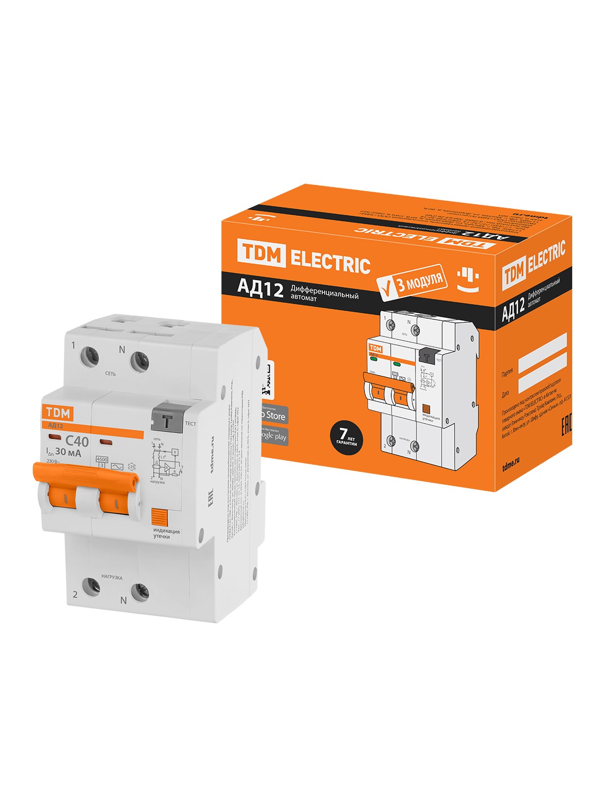 Диф. автомат АД12 2P, C40, 300 мА, 4,5 кА, тип АС, 3 мод, TDM