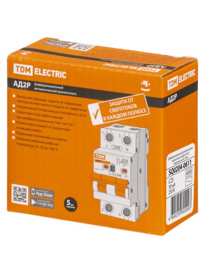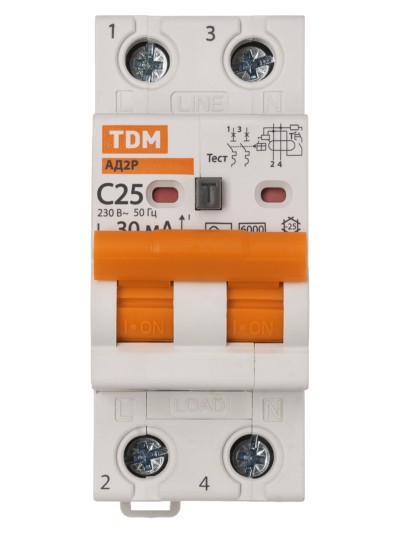 Выключатель АВДТ АД2P 2Р С25 30мА 6кА тип АС TDM