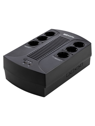 Назначение: Временное обеспечение электропитанием аппаратуры при перебоях в подаче электроэнергии. Применение: Применяются в бытовых, офисных и промышленных целях для предотвращения выхода из строя электрических приборов и их безотказного и бесперебойного функционирования. ИБП оснащен 6 еврорезатками, которые защищают подключенные устройства от импульсных перенапряжений в сети. Три из этих розеток осуществляют бесперебойное питание. Преимущества: Защита от короткого замыкания. 6 евророзеток (3 прямое подключение + 3 ИБП и стабилизации. Быстрый переход на работу от батареи <10 мс. Работа от батареи до 20 мин. Зарядка мобильных устройств 5В 2 А. Конструкция: Материалы: Комплектация: Упаковка: