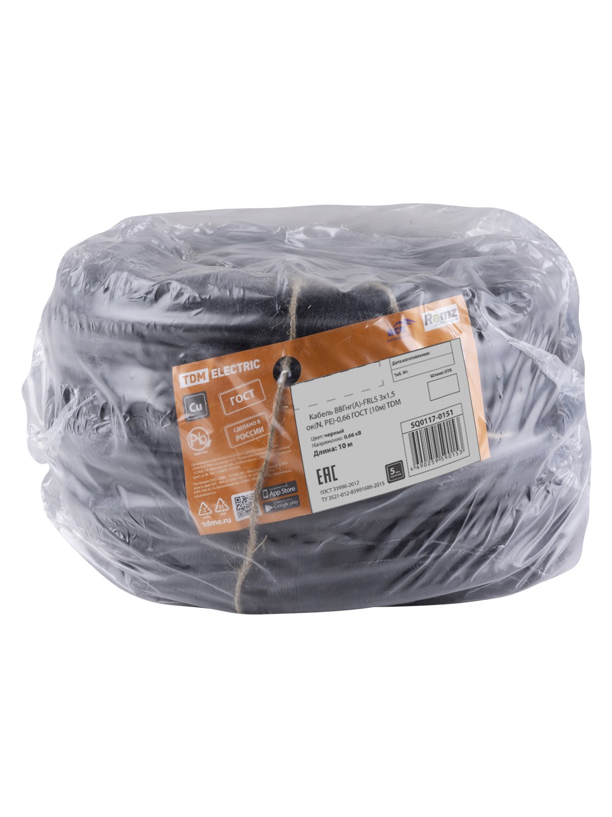 Кабель ВВГнг(А)-FRLS 3х1,5 ок(N, PE)-0,66 ГОСТ (10м) TDM