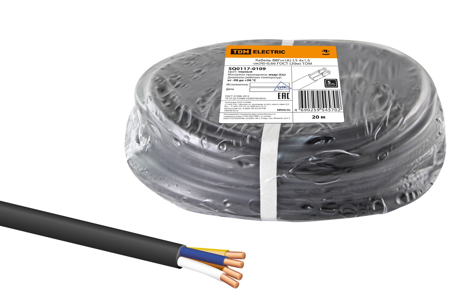 Кабель ВВГнг(А)-LS 4х1,5 ок(N)-0,66 ГОСТ (20м) TDM