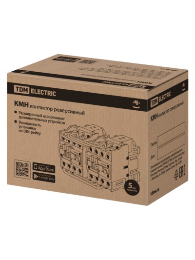 Назначение: Пуск, остановка и реверсирование асинхронных электродвигателей с короткозамкнутым ротором на напряжение до 660 В. Дистанционное управление цепями освещения, нагревательными цепями и различными индуктивными нагрузками (категория применения АС-1) Применение: Преимущества: Расширенная ассортиментная линейка малогабаритных контакторов серии КМН по сравнению с аналогами других отечественных производителей. Большой ассортимент дополнительных устройств (приставки контактные ПКН, приставки выдержки времени ПВН, реле электротепловые РТН). Конструкция: Присоединительные зажимы специальной овальной формы обеспечивают надежную фиксацию проводников. Возможность установки на DIN-рейку Контакторы на ток нагрузки до 40 А имеют один дополнительный контакт, контакторы на ток нагрузки свыше 40 А имеют два дополнительных контакта. Возможность получения реверсивного варианта с использованием механизма блокировки Насечки на присоединительных контактах снижают нагрев проводов благодаря надежной фиксации в местах присоединения. Материалы: Комплектация: Упаковка: