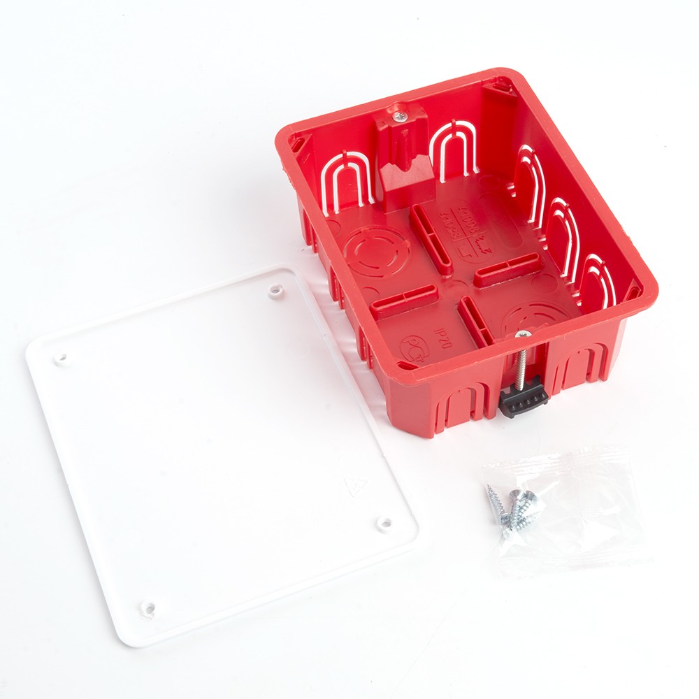 Все товары похожие и смежныеКоробка КМЭУ для полых стен с пластиковыми зажимами с крышкой 92x92x45мм красная Stekker EBX30-02-1-20-92