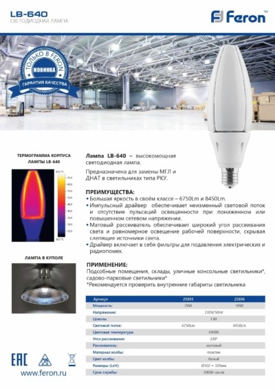 Лампа СДЛ Feron LB-640 E40 70W 6400K