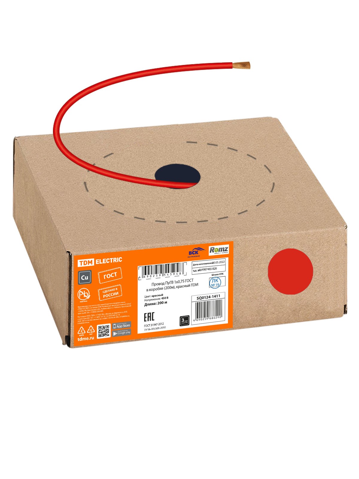 Провод ПуГВ 1х0,75 ГОСТ в коробке (200м), красный TDM