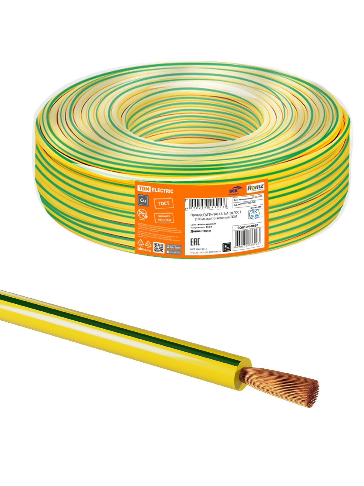 Провод ПуГВнг(А)-LS 1х10,0 ГОСТ (100м), желто-зеленый TDM