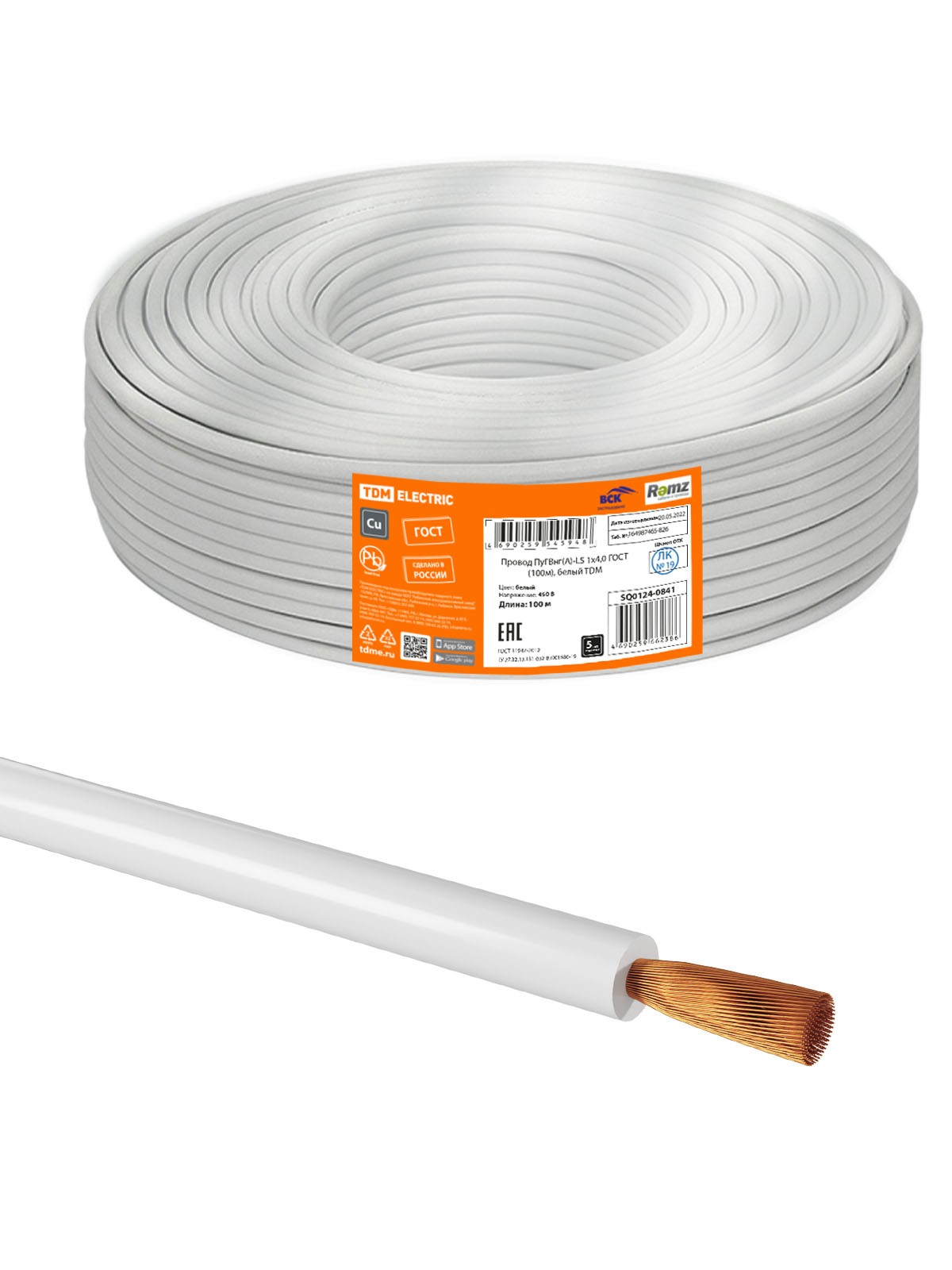 Провод ПуГВнг(А)-LS 1х4,0 ГОСТ (100м), белый TDM