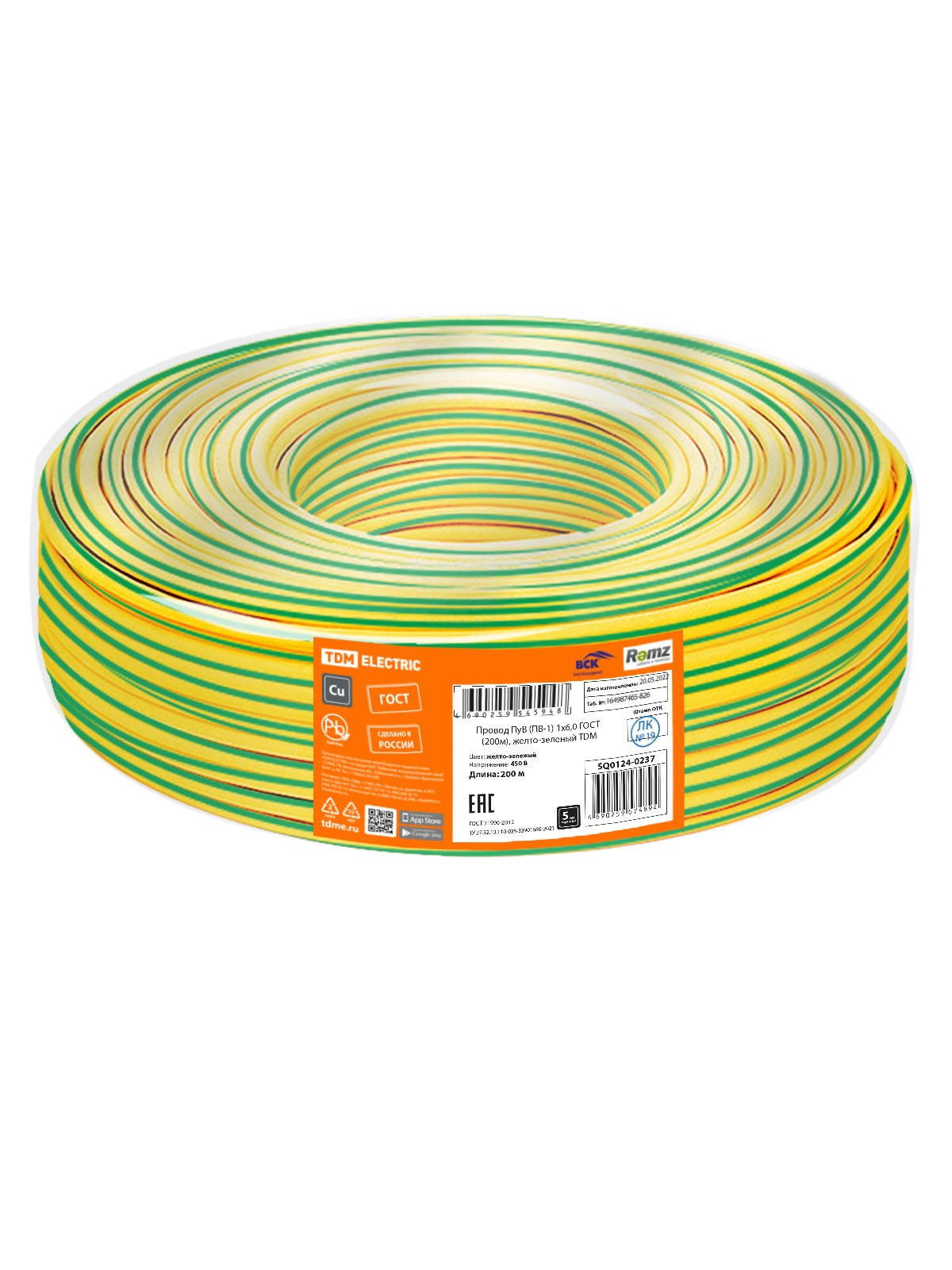 Провод ПуВ (ПВ-1) 1х6,0 ГОСТ (200м), желто-зеленый TDM