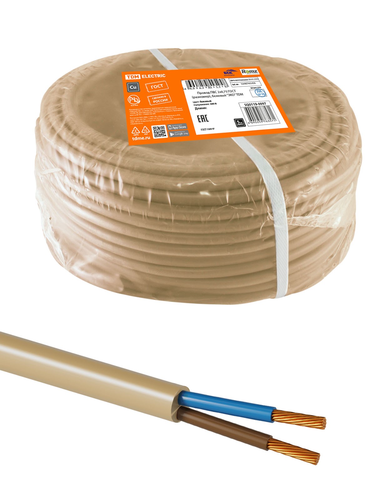 Провод ПВС 2х0,75 ГОСТ (разномер), бежевый “ЭКО” TDM