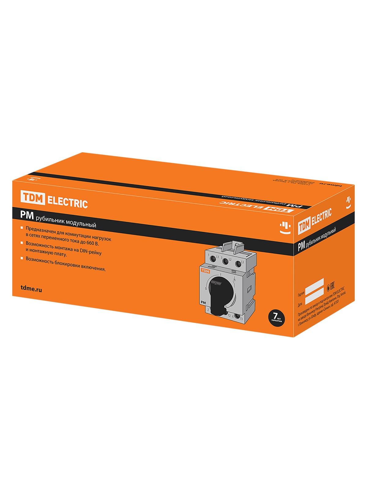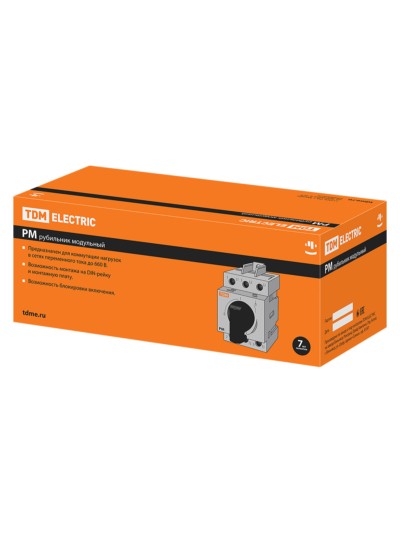 Назначение: Проведение тока в нормальном режиме. Частое оперативное включение и выключение электрической цепи. Применение: Пункты управления отдельными нагрузками: двигателями, насосами, станками и т. д. Вводно-распределительные устройства для жилых и общественных зданий. Преимущества: Повышенная коммутационная способность АС-23 А позволяет использовать рубильник для нагрузок смешанного типа и электродвигателей. Двойной разрыв каждой фазы. Механизм быстрого включения и отключения. Номинальное выдерживаемое импульсное напряжение 8 кВ. Конструкция: Материалы: Контактная группа рубильника выполнена из электротехнической меди с гальваническим покрытием, что предотвращает ее окисление в процессе эксплуатации. Корпус рубильника выполнен из негорючего полиамида, армированного стекловолокном (PA6.6). Комплектация: Упаковка: РМ-16 по 6 шт. РМ-20 по 6 шт. РМ-25 по 6 шт. РМ-40 по 6 шт. РМ-63 по 6 шт. РМ-80 по 4 шт. РМ-100 по 4 шт. РМ-125 по 4 шт.