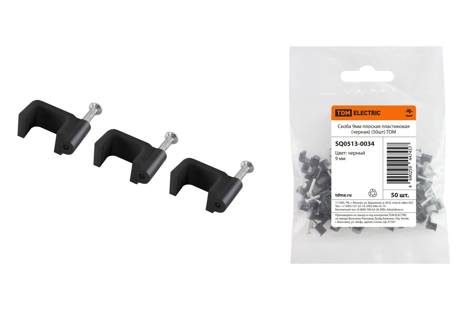 Скоба 9мм плоская пластиковая (черная) (50шт) TDM