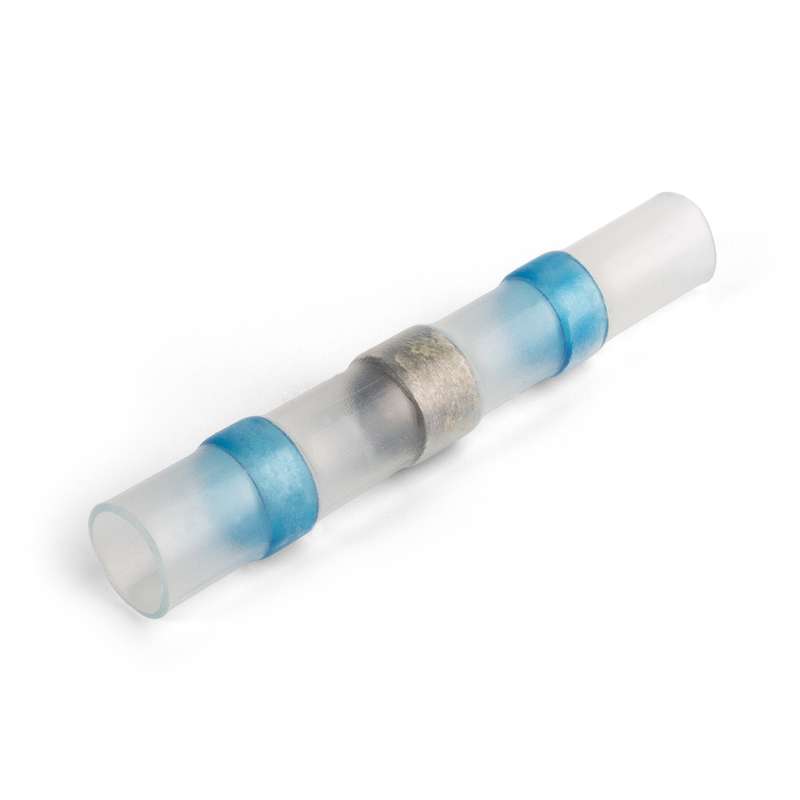 • Предназначены для паяного соединения встык многопроволочных медных проводов. Не требуют использования канифоли для монтажа • Материал изоляции: сшитый полиэтилен. Не содержит галогенов • Термостойкость изоляции: 125 °C • Максимальное напряжение: 690 В • Особенности конструкции: • в центре соединителя расположено кольцо низкотемпературного припоя • по краям соединителя на внутренней поверхности термоусаживаемой трубки интегрированы цветные пояски термоплавкого клея, обеспечивающие полную герметичность соединения после усадки • Прозрачная изоляция обеспечивает визуальный контроль в процессе монтажа • Цвет поясков термоплавкого клея помогает идентифицировать размеры • Порядок монтажа: • разместите соединитель на одном из проводов, сдвинув его в сторону от предварительно зачищенных концов жил • распушите отдельные проводники и соедините концы жил встык таким образом, чтобы концы проводников заходили друг в друга • обожмите руками выступающие проводники, сформировав место стыка • сдвиньте соединитель на место контакта таким образом, чтобы поясок припоя располагался по центру соединяемых зачищенных жил • используя бутановую горелку или высокотемпературный фен, равномерно прогрейте припой со всех сторон до его расплавления • дайте изделию остыть • Инструмент для монтажа: высокотемпературный фен