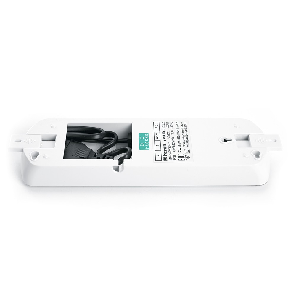 Светильник FERON EM110 AC/DC с наклейкой, 30LED/дневной, 110-240V, IP20, аккумулятор 3,6/400 mAh/никель-кадмиевый, количество режимов 2, время зарядки 5 часов, время работы 1 час, цвет белый, 205*31*58мм