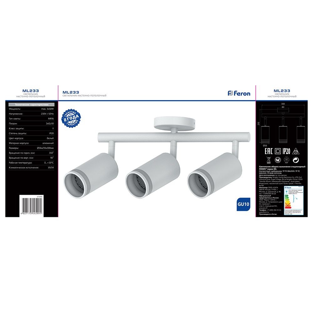 Светильник накладной под лампу, поворотный (ИВО) FERON ML233, GU10 3*50W, 230V, IP20, цвет белый, корпус алюминий, 300*56*210
