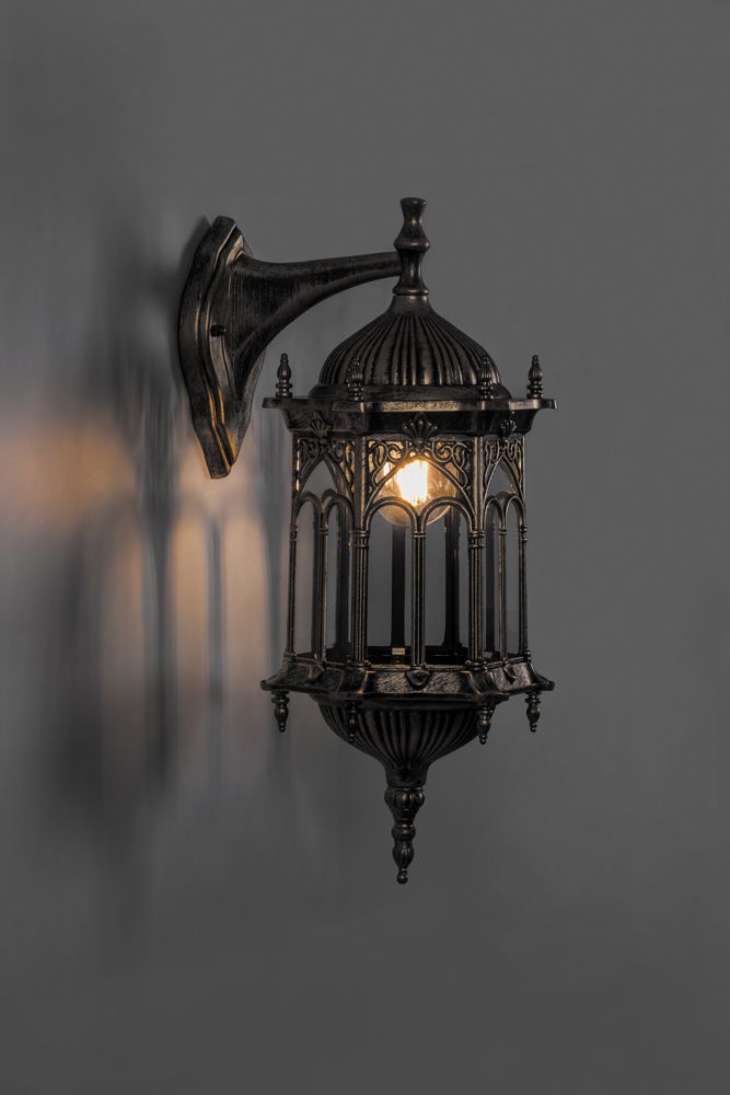 Светильник садово-парковый, серии «Багдад», (НБУ) FERON PL113 60W, E27, 230V, IP44, цвет черное золото, 6-и гранник, на стену вниз, 205*240*470мм
