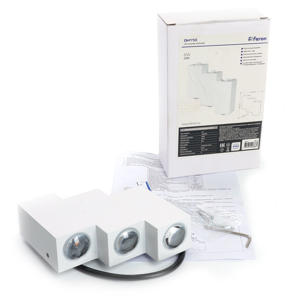Светильник уличный светодиодный, на стену (ДБУ) FERON DH110, серия Нью-Йорк, 6W, 3000К (белый натуральный), 230V/50Гц, 600Lm, IP54, 6LED*SMD3030, класс защиты 1, раб.t -40°C...+40°C, цвет белый, корпус алюминий, 120*35*120мм,