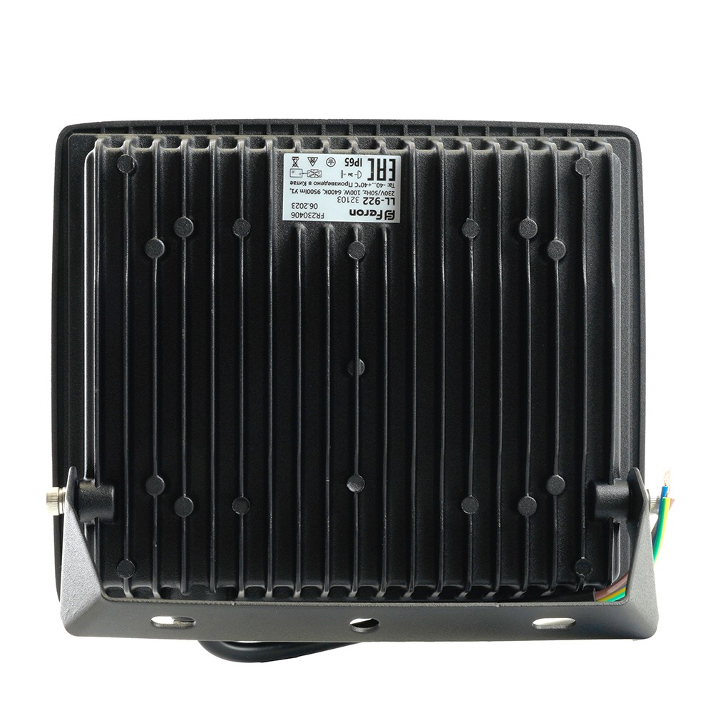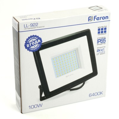 Прожектор светодиодный многоматричный с монтажным креплением на кронштейн, (ДО) FERON LL-922, 100W, 6400К (холодный белый), 230V/50Гц, 9500Lm, IP65, угол рассеивания 120°,*SMD2835, раб.t -40°C - +40°C, цвет чёрный, корпус алюминий литой под давлением + стекло, 185*37*177 мм