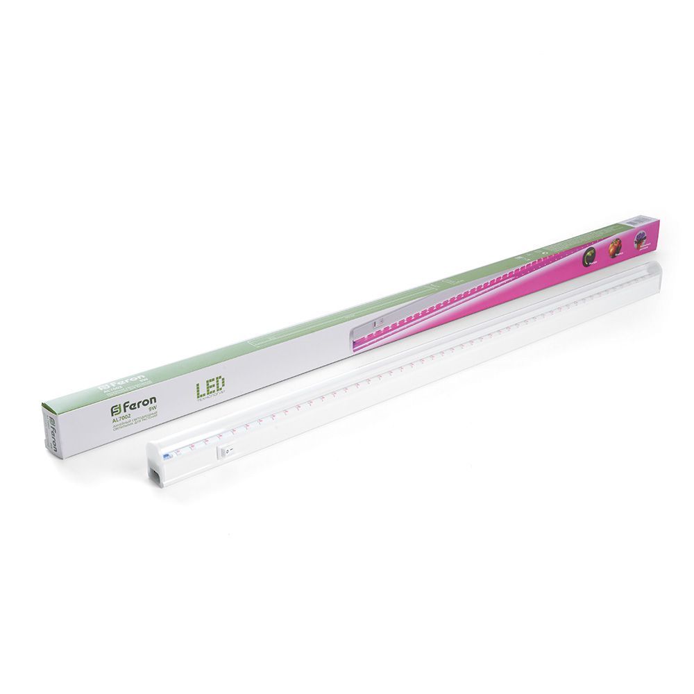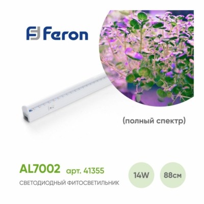 Светильник линейный светодиодный, для растений (ДББ) FERON AL7002, 14W, спектр фотосинтез (полный спектр), 230V, 1100Lm, IP40, цвет белый, корпус пластик, рассеиватель пластик, 873*20*31 мм