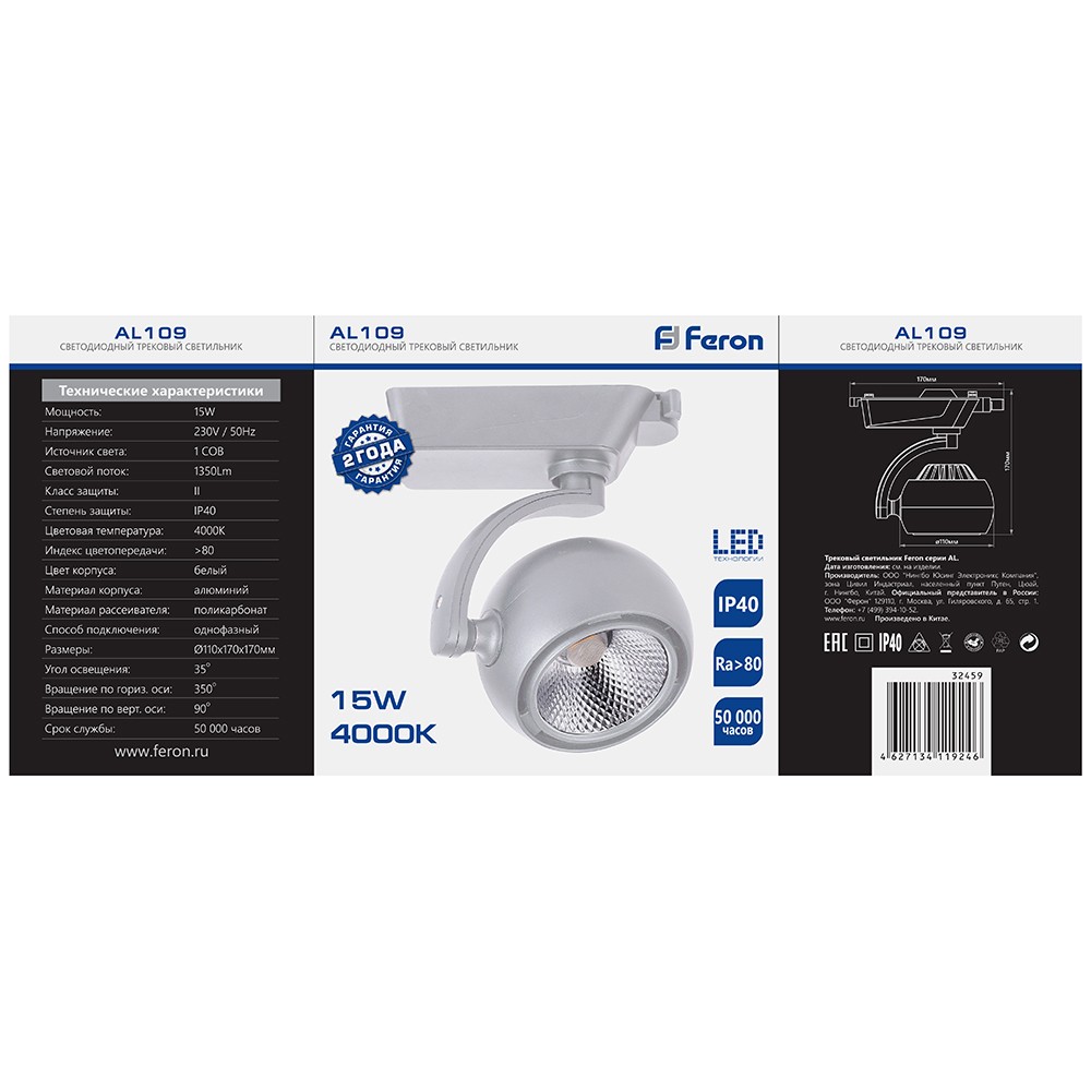 Светильник трековый на шинопровод, однофазный (ДПО) FERON AL109, 15W, 4000К (белый), 170-265V, 1350Lm, цвет белый, корпус алюминий, рассеиватель поликарбонат, вращение →350°/↓90°, 170*110*170 мм